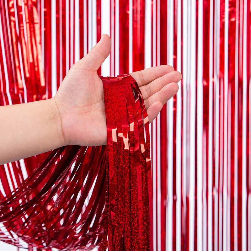 Rideau de franges métalliques PET multicolore accrocheur conçu comme une toile de fond de Noël. Cette décoration murale crée des effets visuels époustouflants pour divers événements et célébrations.