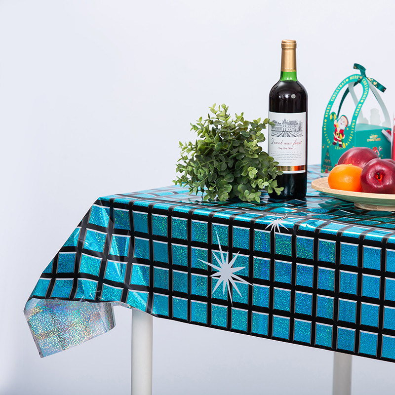 Rectangle Laser Pet Film Disco Event Table Cloths for indoor and outdoor party decoration. Made from high-quality laser pet film, this tablecloth is both durable and lightweight, with a shimmering surface that adds elegance to any event.